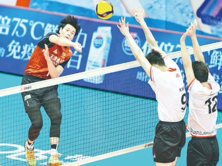 ▲8月24日,天津食品集团队球员罗壮(左)在比赛中扣球。 当日,在河北省秦皇岛进行的2019-2020赛季中国男子排球超级联赛第二阶段G组比赛中,天津食品集团队以3比0战胜辽宁队。