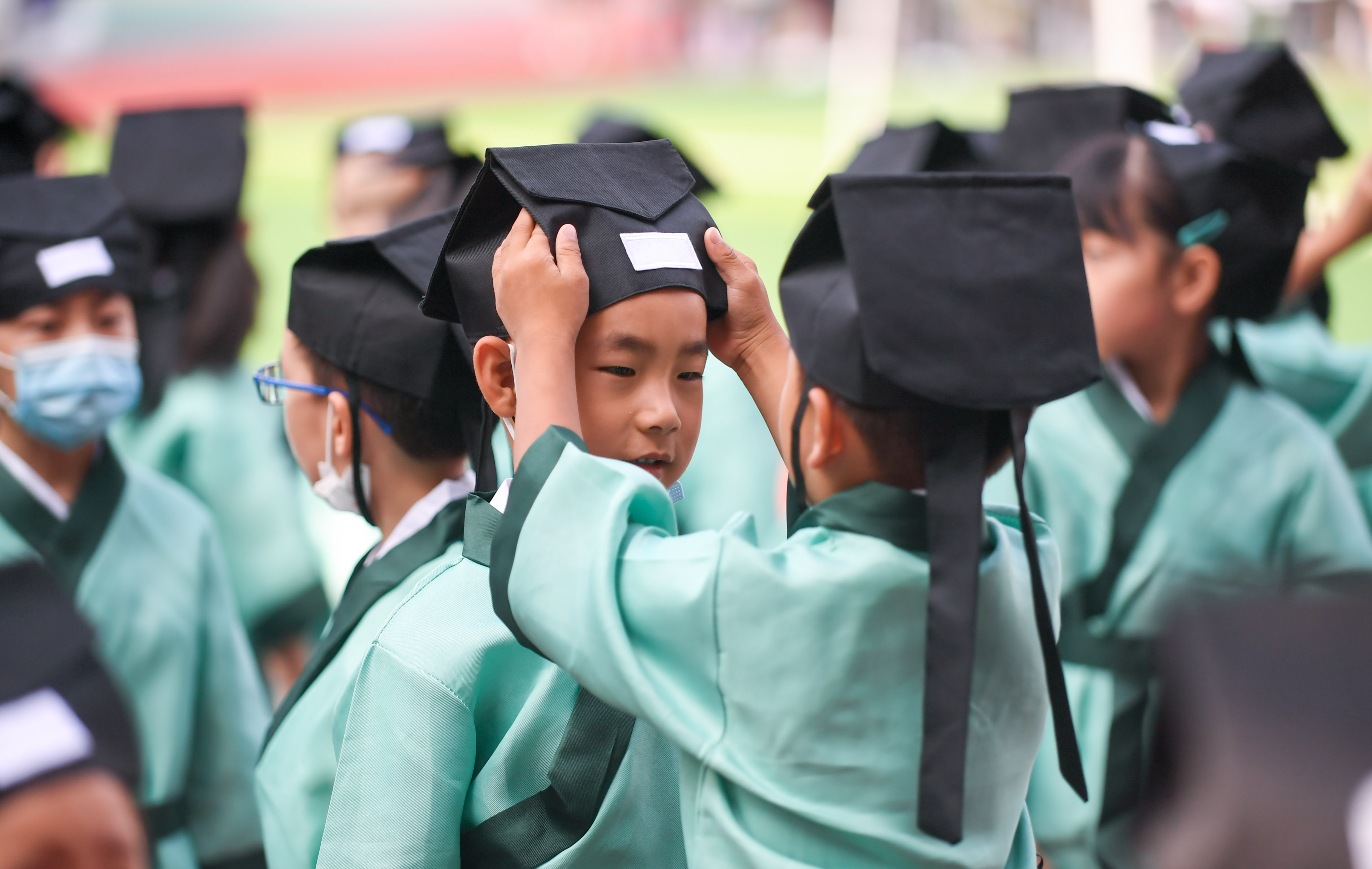 8月25日,长春市朝阳区北安小学的一年级新生在开笔礼仪式上为自己的同学端正衣冠。 当日,吉林省长春市朝阳区北安小学举办2020年秋季开学典礼暨一年级新生开笔礼。小朋友们在开笔礼仪式上通过端正衣冠、拜师行礼、朱砂启智等形式,感受传统文化的魅力。 新华社发(颜麟蕴 摄)