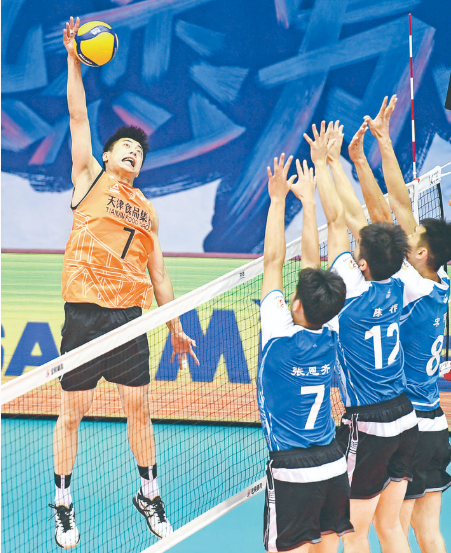 当日,在河北秦皇岛进行的2019-2020赛季中国男子排球超级联赛第二阶段G组比赛中,天津食品集团队以3比0战胜湖北队。 新华社记者 朱旭东 摄