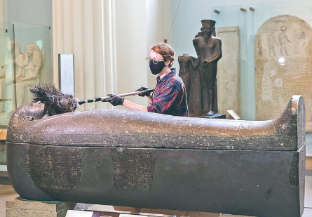 ◀8月25日,一名工作人员在英国伦敦的大英博物馆举行的媒体预展上将展品上的灰尘掸掉,为博物馆重新开放做准备。 因疫情关闭数月的大英博物馆将于8月27日重新对公众开放。