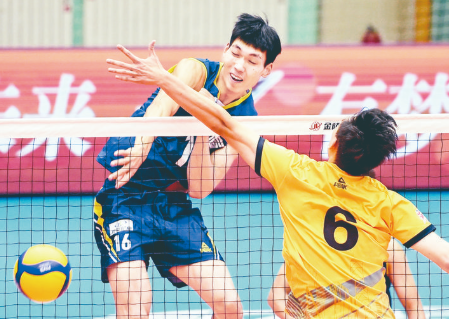 ▶8月26日,四川劲浪体育队球员彭世坤(左)在比赛中扣球。 当日,在河北秦皇岛进行的2019~2020赛季中国男子排球超级联赛第二阶段E组比赛中,四川劲浪体育队以3比0战胜上海金色年华队。 新华社记者 朱旭东 摄