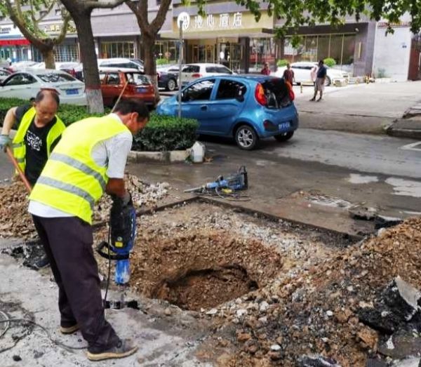 ▲市政工人修补红旗东街破损路面 祁克宁 摄