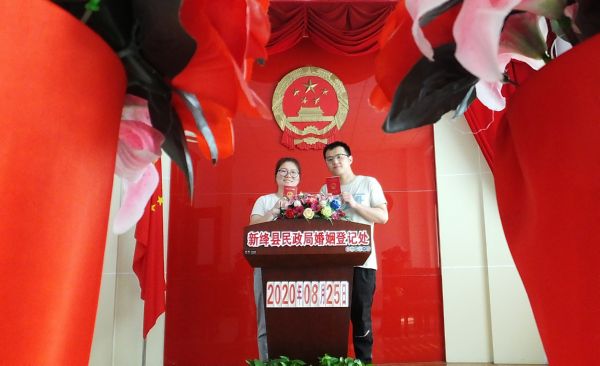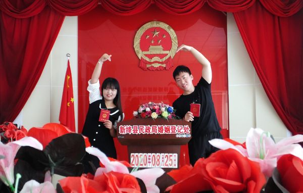 8月25日,一对新人在新绛县民政局婚姻登记处登记领取结婚证后拍照留念。