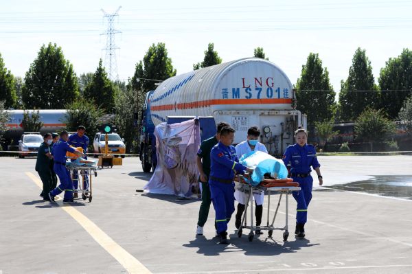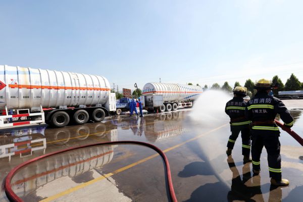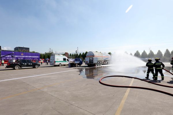 当天,运城市人民政府在河津举行2020年危化品运输车辆交通事故应急处置演练。事故模拟一辆载满液态天然气的危化品罐车与三轮车发生追尾事故,应急救援部门接到报警后,立即组织交警、消防、气象等部门,对事故现场进行勘察和路面清理。此次演练,旨在提升辖区危化品运输应急队伍的技术水平、信息化水平、协作水平和救援指挥水平。 特约摄影 李泓晓