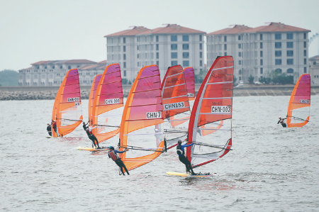 ▲8月27日,参赛选手在女子RS:X级帆板比赛中。 当日,2020年全国帆板锦标赛在河北省秦皇岛市北戴河新区海域开赛。