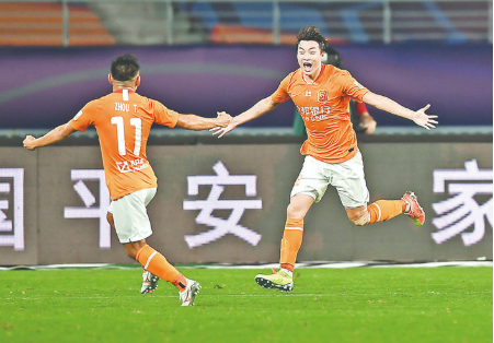 ▶8月26日,武汉卓尔队球员廖均健(右)与队友周通庆祝进球。 当日,在2020赛季中国足球协会超级联赛第一阶段(苏州赛区)第七轮比赛中,武汉卓尔队以2比1战胜天津泰达队。