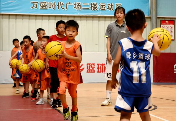8月24日,在垣曲县舜乡篮球俱乐部,爱好篮球的孩子们在教练的辅导下进行训练。暑假以来,该县一批中小学生积极参加篮球、足球等球类体育活动,强身健体,增强了团队精神和拼搏精神。
