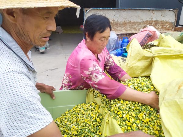 合作社新建的菊花烘干加工厂,车间宽敞明亮,工人们正在把菊胎和菊花进行分拣。随着烘干机隆隆作响,一盘盘烘干后的菊花被整齐地码放到院里,准备包装后外销。