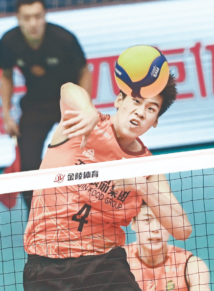 8月28日,天津食品集团队球员张昕宇在比赛中扣球。