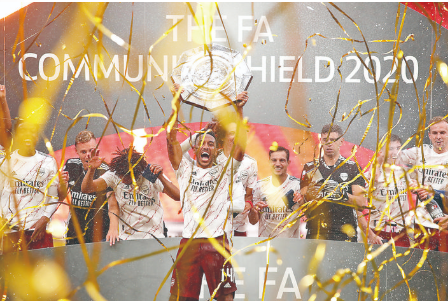 ◀8月29日,阿森纳队球员奥巴梅扬(前)在颁奖仪式上高举奖盘庆祝。 当日,在2020英格兰社区盾杯足球赛中,阿森纳队与利物浦队在90分钟内战成1比1平,经过点球大战,阿森纳队以6比5的总比分战胜利物浦队,获得冠军。