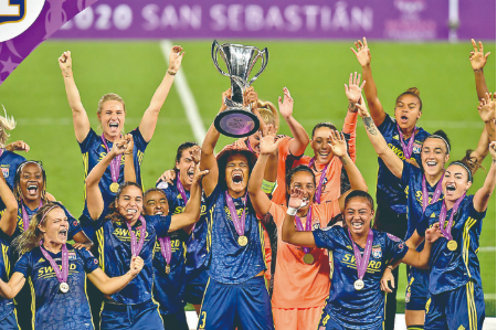 ▲8月30日,里昂队球员在颁奖仪式上庆祝夺冠。 当日,在2019-2020赛季女足欧冠决赛中,法甲里昂队以3比1击败德甲沃尔夫斯堡队,夺得冠军。新华社/法新