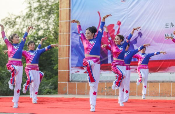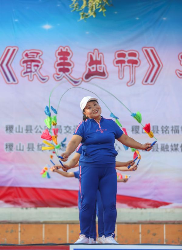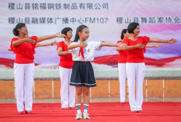 8月27日,参赛选手在稷山县民乐园文化广场的舞台上,表演交通安全宣传广场舞“最美出行”。当天,稷山县“最美出行”交通安全广场舞大赛,在该县民乐园文化广场举行,来自该县各乡、镇、街道办的13支参赛队伍参加了比赛。