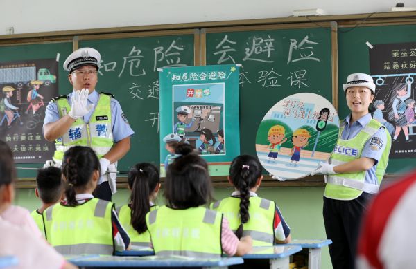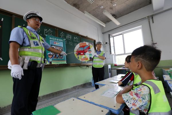 ▲9月1日,民警在河津市第三小学开展“开学季,交通安全体验课”宣讲活动。