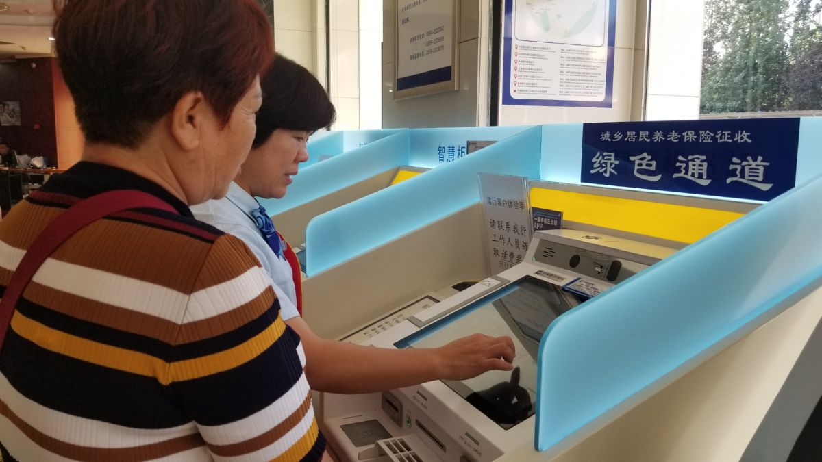 9月2日下午,在中国建设银行运城分行业务经营部大厅,工作人员帮市民通过自助机缴纳城乡居民医保费。 范楚乔 摄