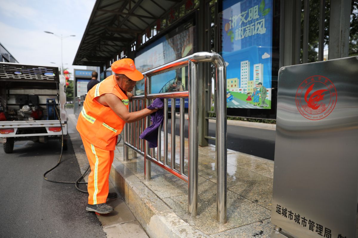 环卫工人擦拭公交站台栏杆 祁克宁 摄
