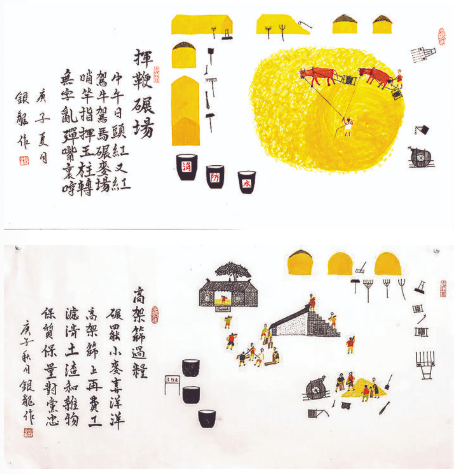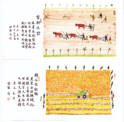 “村长打钟”“调工牌”“田间撒粪”“前耙后耱”“犁耕沃野”“摇耧播种”“锄麦除草”“集体割麦”“铁脚牛车”“马车载麦”“学生拾麦”等,一幅幅作品翔实刻画了上世纪六七十年代以来小麦从播种到管理,再从收割到打碾成粮的各个环节,情节丰富、场景生动。画中弯腰割麦的人、麦场拉碾的牛、田地拉犁的马等被勾画得栩栩如生,还有人们手中挥动的镰刀、锄头、木杈,麦场边的水瓮、手扶收割机、联合收割机等也都惟妙惟肖。