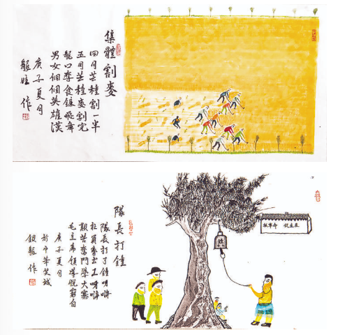 社员们只要在家一听见钟声,就会全员出工,站在生产队的树下等候队长分工。队长拿着调工牌,给每个人细分工作。种麦得先平地,大家用平车一车车把粪散到地里,然后用铁锨一点点撒开。然后,赶着牛先耙后耱整地,再请好把式赶着牛犁地、摇耧,播上麦种。最后用石碾碾压,等麦子发芽。麦子长出来,除草、施肥要勤快,才能茁壮成长。