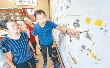 那天,记者正在采访时,附近几个邻居也来了,有3个都是上了年纪的。黄银龙便兴致勃勃地向大家解释自己墙上的画,画的到底是什么。