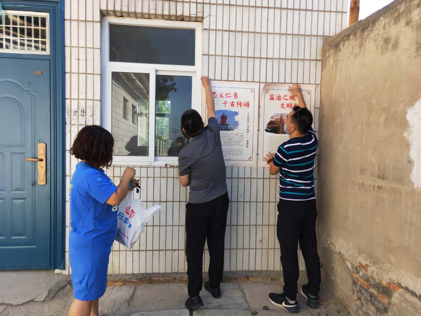 ▲9月2日,盐湖区人社局失业保险服务中心工作人员在社区张贴创建文明城市宣传画。
