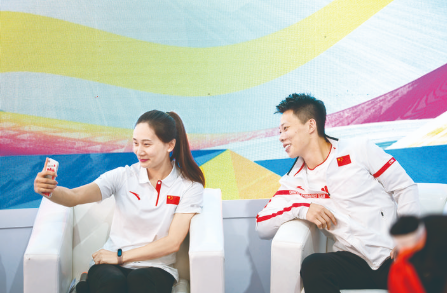 ◀9月5日,体操世界冠军程然(右)、张楠在服贸会现场活动中自拍。 当日,在2020年中国国际服务贸易交易会文化服务专题展文化体育融合展区,体操世界冠军程然、张楠参与面对面采访活动,并与观众对话,讲述个人体坛经历,传播奥林匹克文化。 新华社记者 陈钟昊 摄
