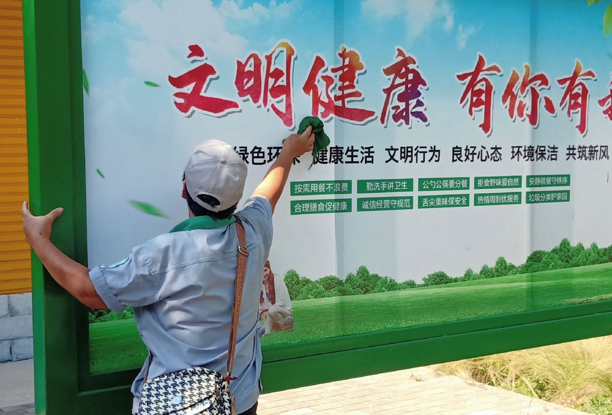 ▲公园工作人员擦洗文明宣传栏 廖旌汝 摄