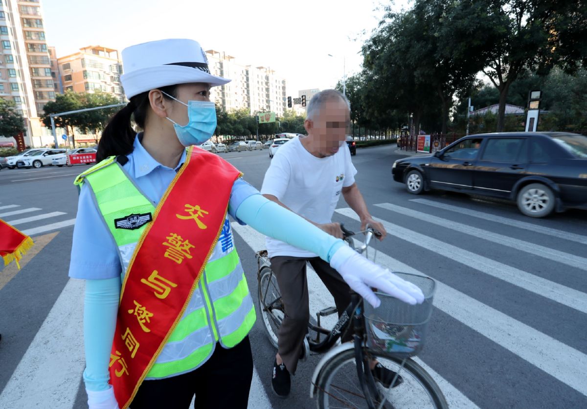 9月3日,民警在市区盐湖城岗劝导非机动车有序通行。