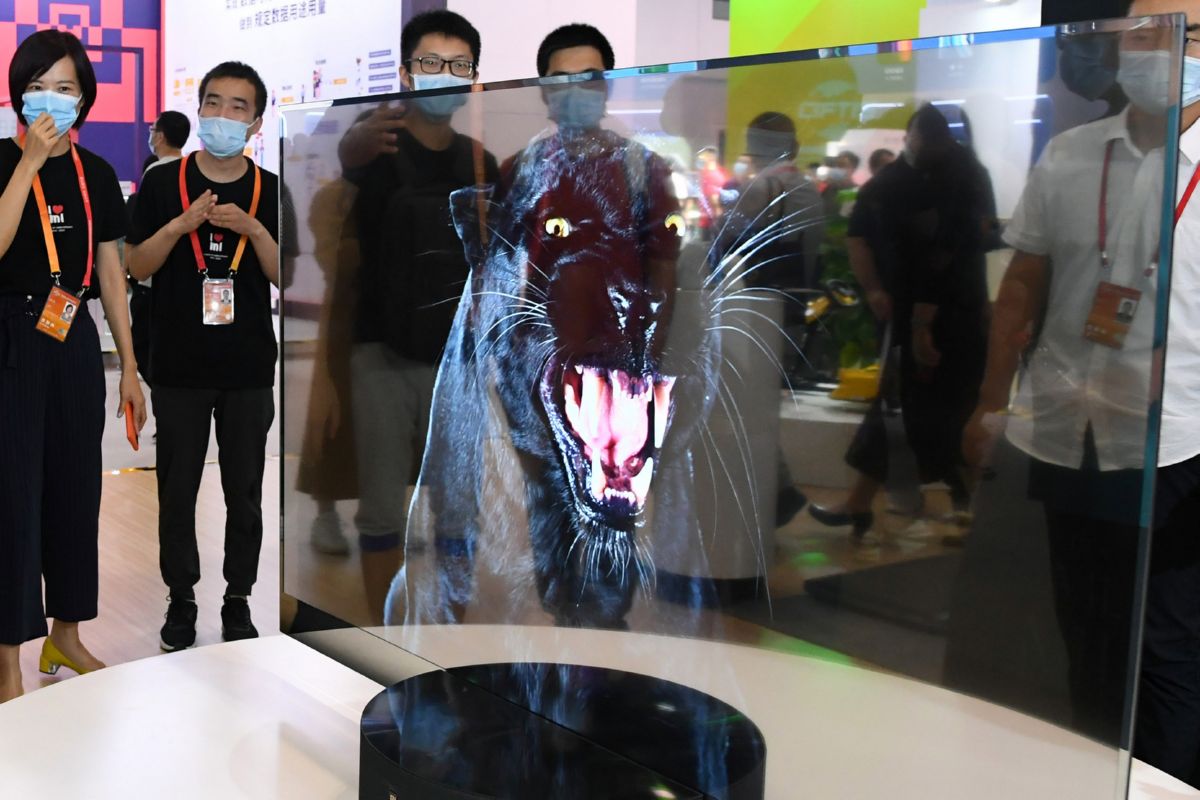 9月6日,观众在服贸会综合展区参观“透明电视”。