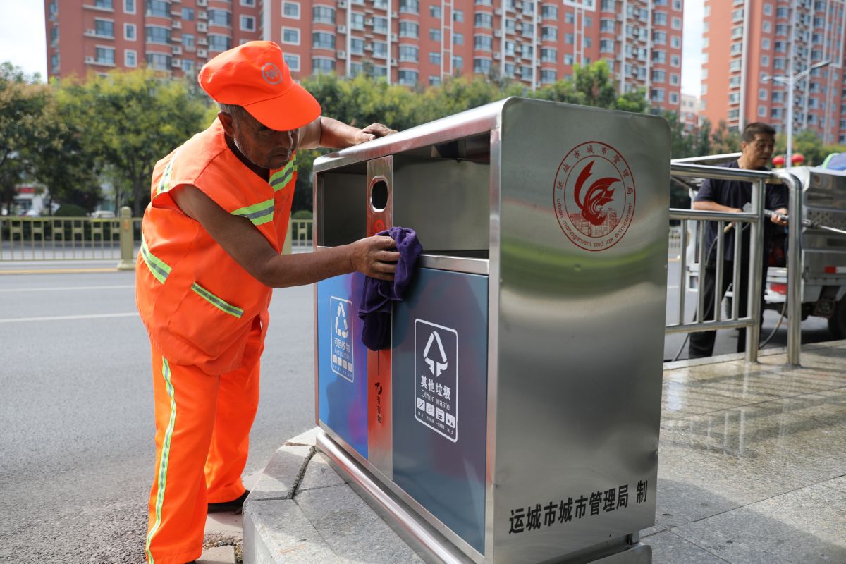 ▲在市区河东东街一公交站台,环卫工人擦洗垃圾箱。 祁克宁 摄