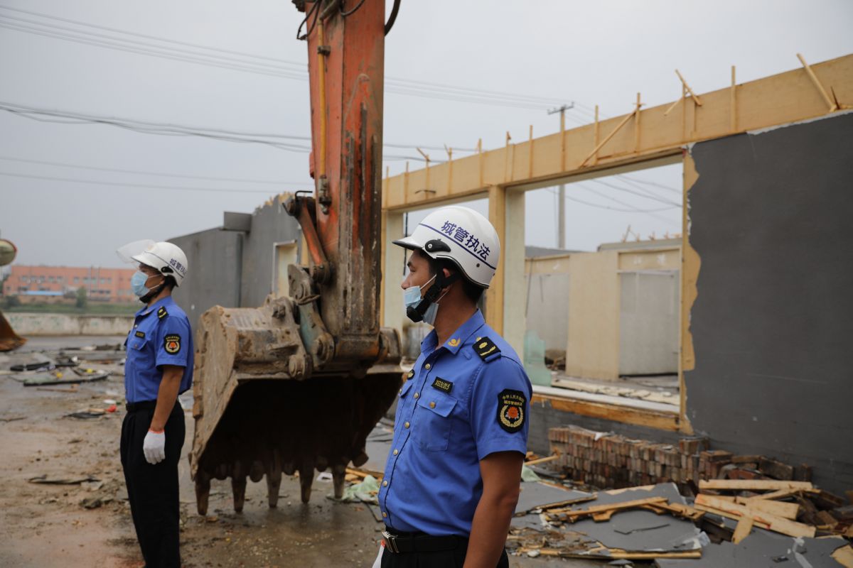 ▲在市区安邑水库周边,市综合行政执法队组织执法人员用作业器械拆除违建。 祁克宁 摄