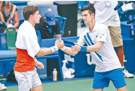 9月6日,焦科维奇(右)与布斯塔在比赛后握手致意。 当日,在2020美国网球公开赛对阵西班牙球手布斯塔的男单八分之一决赛中,塞尔维亚选手焦科维奇在自己的一个发球局遭破发后,将球击向身后,击中一位司线裁判,随后组委会根据规则取消了焦科维奇参加本次美网的资格。