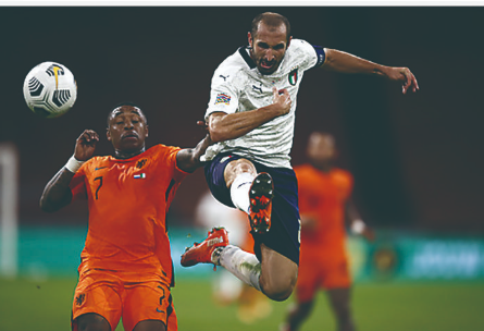 ▲9月7日,意大利队球员基耶利尼(右)与荷兰队球员博格维恩在比赛中拼抢。 当日,在瑞士巴塞尔进行的2020欧洲国家足球联赛A级第一组第二轮比赛中,意大利队以1比0战胜荷兰队。