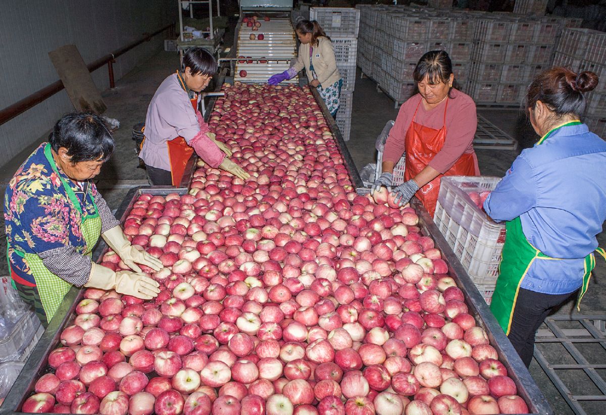 ▲华荣果业有限公司员工在生产车间清洗苹果