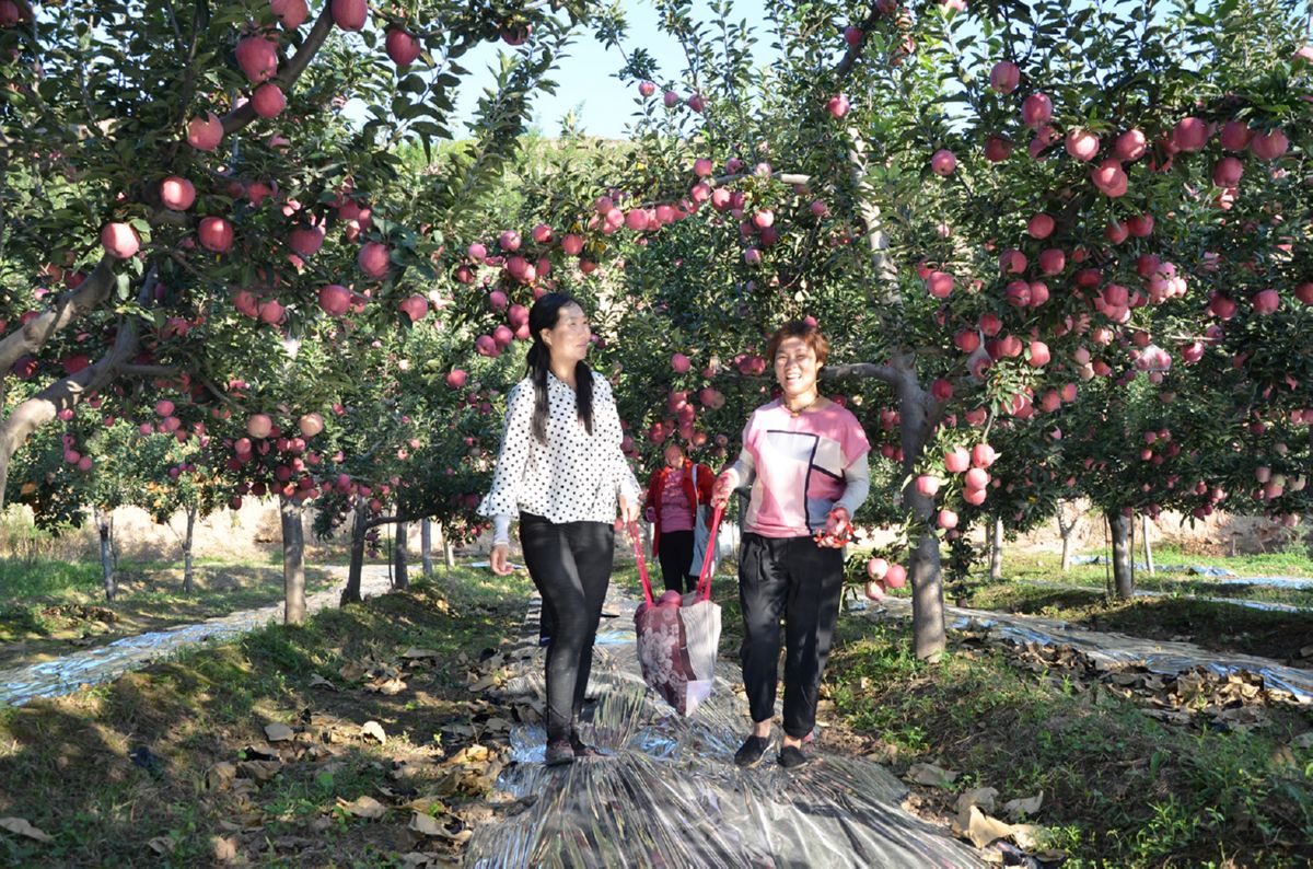 ▲东文村果农秦云(左)带领打工的妇女采摘苹果