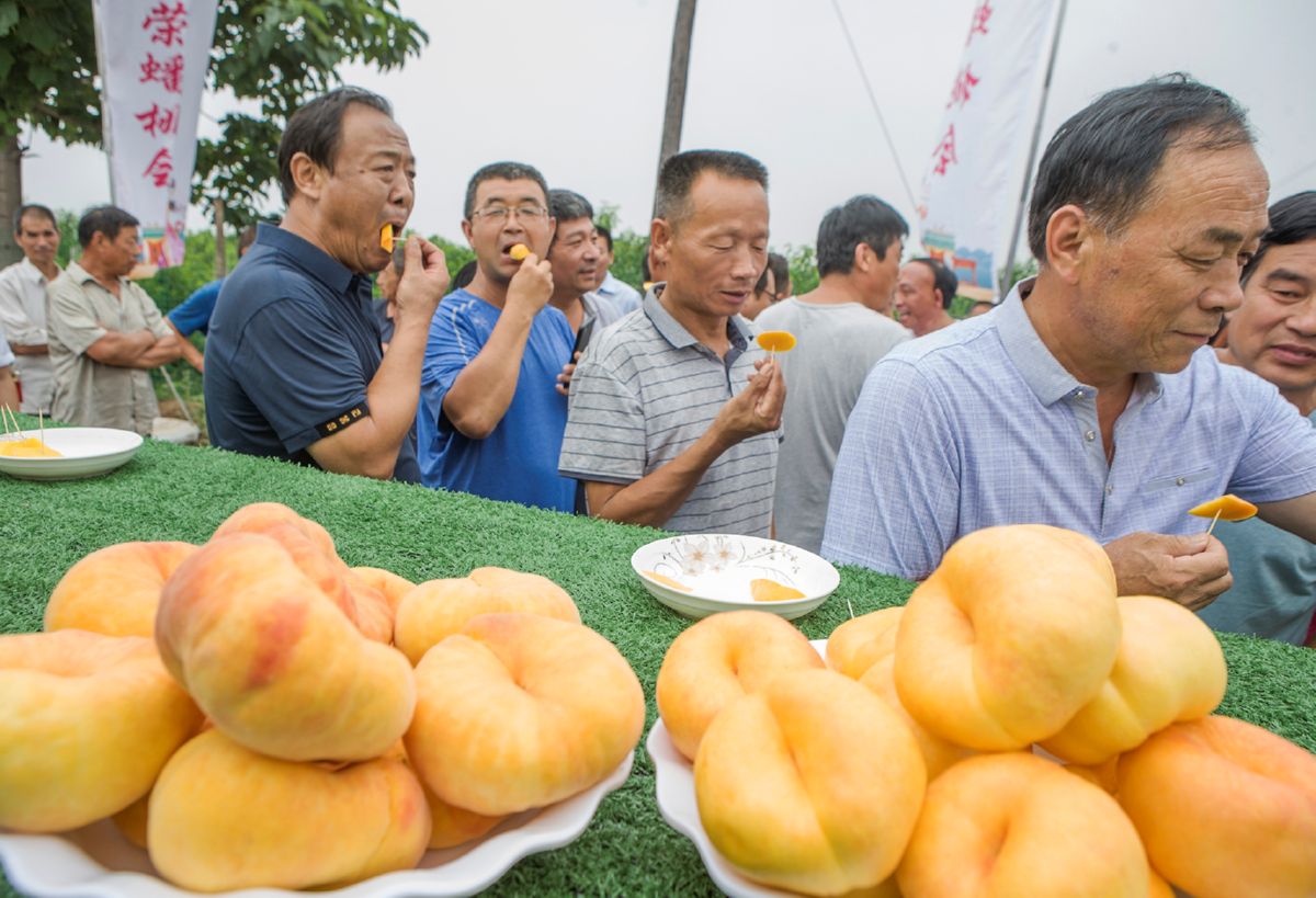 ▲上阳村举办的蟠桃盛会上,游客们品尝新鲜蟠桃。
