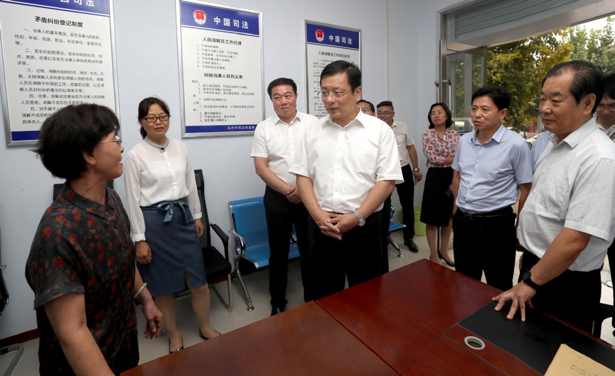 在矛盾纠纷调处化解中心,丁小强与人民调解员张克强、姚乃善、李会民、薛高吉等亲切交谈,称赞他们的工作做得有声有色、成效明显。丁小强指出,要充分发挥老同志、老干部阅历丰富、经验充足优势,支持他们参与人民调解工作,将矛盾化解在基层,将纠纷解决在基层;要认真总结永济“非诉调解”的好经验,在全市范围内加以推广。