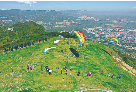 ▶9月9日,太原尖草坪崛围山航空飞行营地,不少市民在专业教练的带领下,体验滑翔伞飞行。近年来,太原东西山生态环境不断改善,旅游公路四通八达,群众性体育健身活动日益兴旺,曾经“高大上”的飞行、跳伞、航模等运动,也成为太原市民户外运动、休闲活动的常规选项。每到节假日,崛围山航空飞行营地总是迎来不少圆自己飞行梦的爱好者。