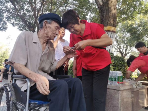 9月7日,该协会组织志愿者在市区圣惠公园开展文明城市创建志愿服务时,看到公园长凳上躺着一位身形瘦弱的老人,头下枕着一把拐杖。志愿者看着老人好像不舒服的样子,便上前询问,确认老人确实身体不适后,连忙帮老人服下其携带的药品,并帮着找到老人的老伴。随后,志愿者将两位老人送回了家。