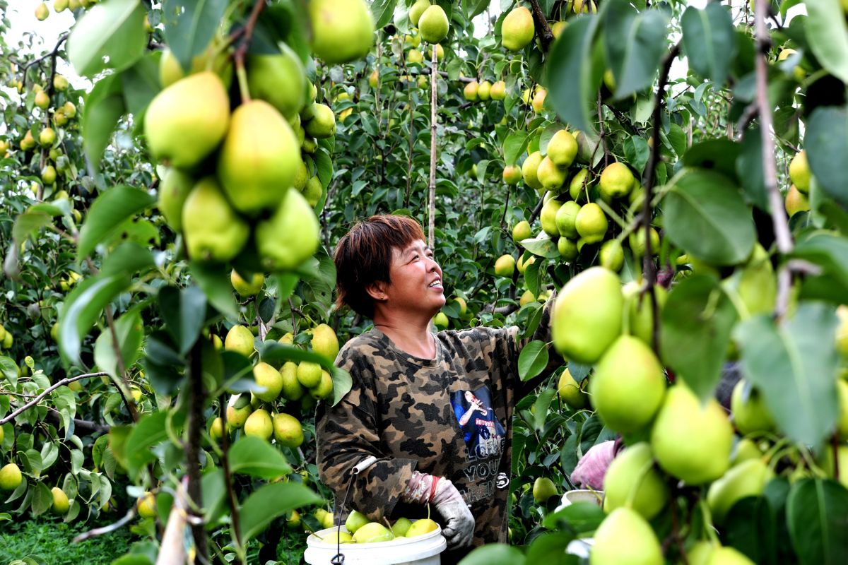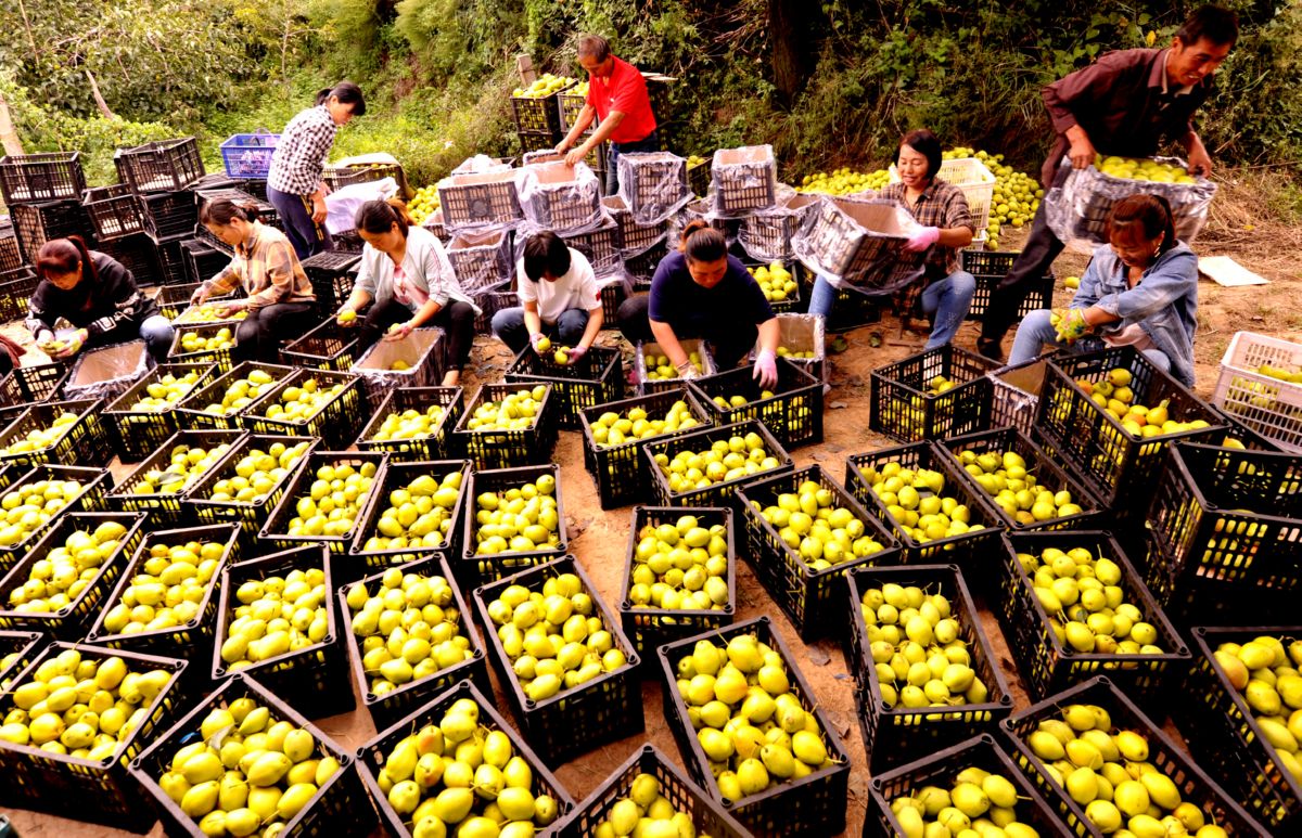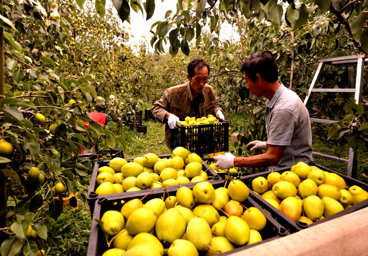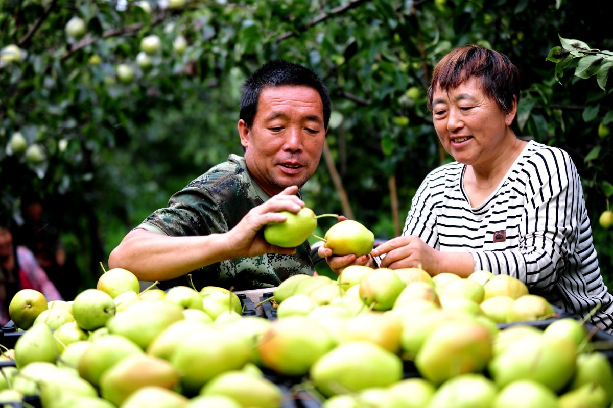 9月9日,万荣县万泉乡桥头村梨农在忙着筛选红香酥梨并装筐。