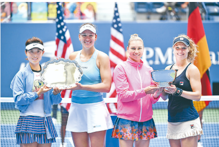 ▲9月11日,徐一璠(左一)、梅里查尔(左二)与兹沃娜列娃(右二)、西格蒙德在颁奖仪式上。 当日,在2020美国网球公开赛女双决赛中,徐一璠(中国)/梅里查尔(美国)以0比2不敌西格蒙德(德国)/兹沃娜列娃(俄罗斯),获得亚军。 新华社/路透