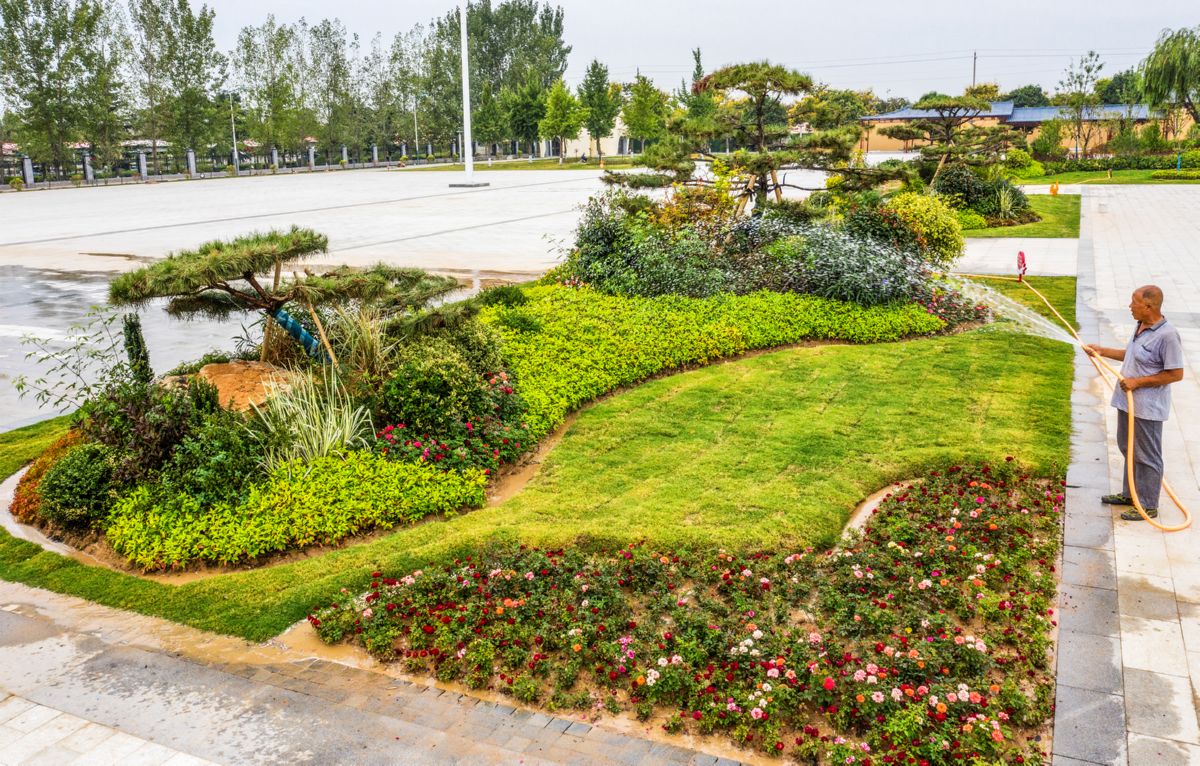 黄河农耕文明博览园实景花海区,园林工人在浇水养护。记者 高志勇 冯革才 摄