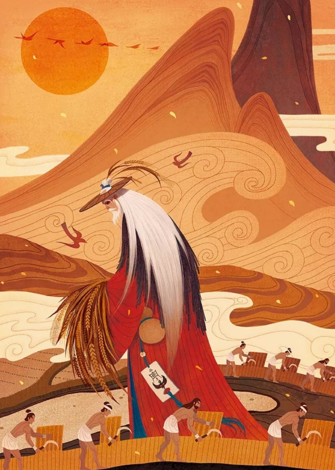 c.有一年,新麦要收获之际,一条恶龙来此兴风作浪。后稷就挥舞宝剑,与恶龙搏斗。打败恶龙,风止水退。