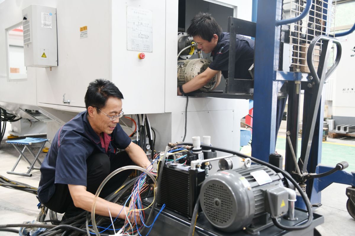 9月14日,山西风源机械制造有限公司车间技术工人在组装九轴旋风铣数控机床。