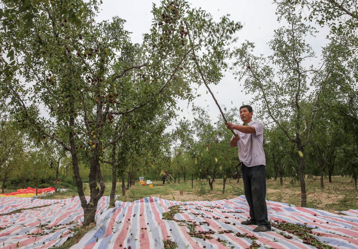 ▲9月14日,稷山县稷峰镇寺后窑村村民马云雨和家人,在自家枣园里挥杆敲打成熟的红枣并将其装箱。