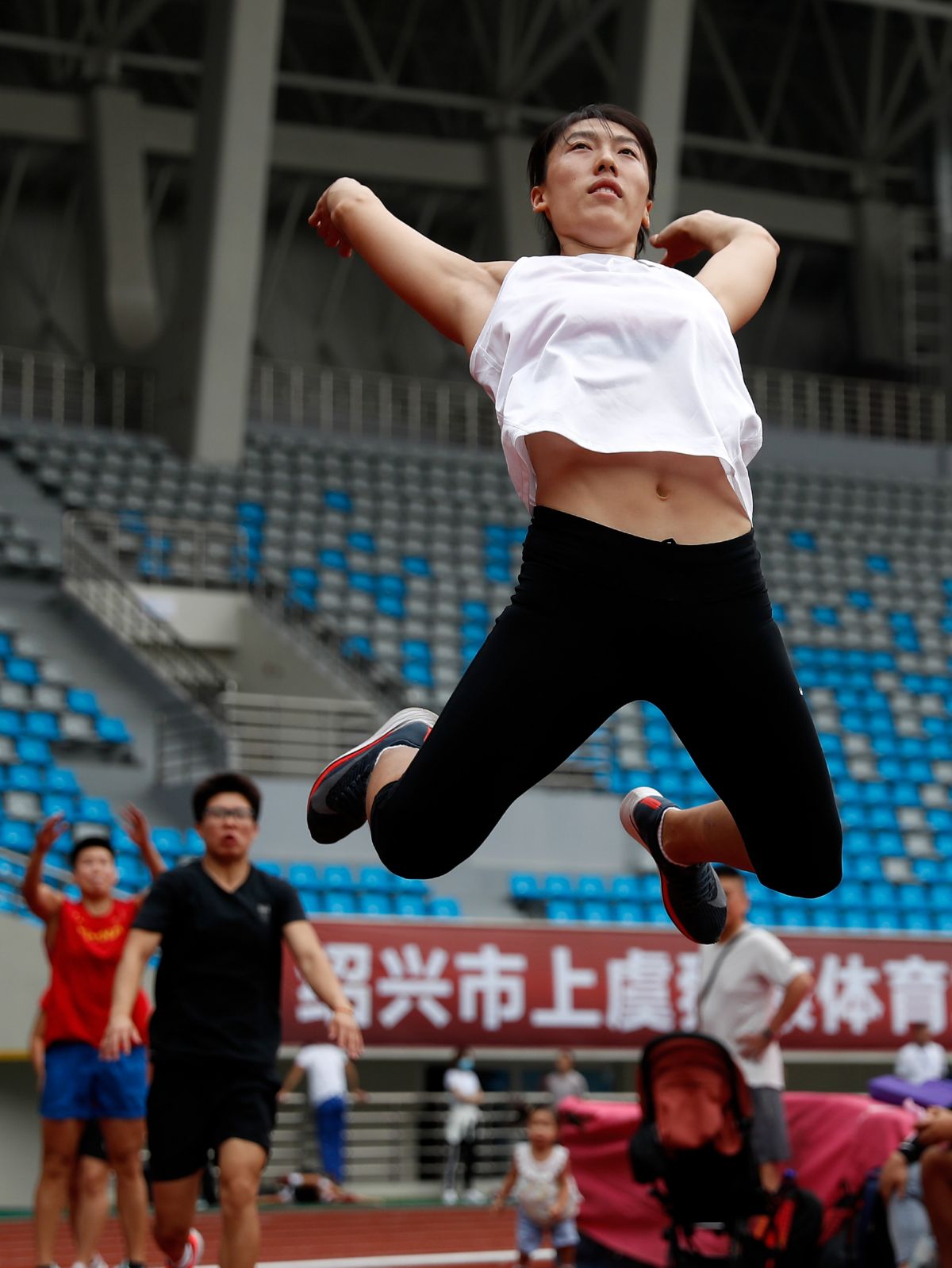 当日,参赛运动员在浙江省绍兴市上虞体育场进行场地适应训练,备战将于9月15日至18日在这里举行的2020年全国田径锦标赛。 新华社记者 王丽莉 摄