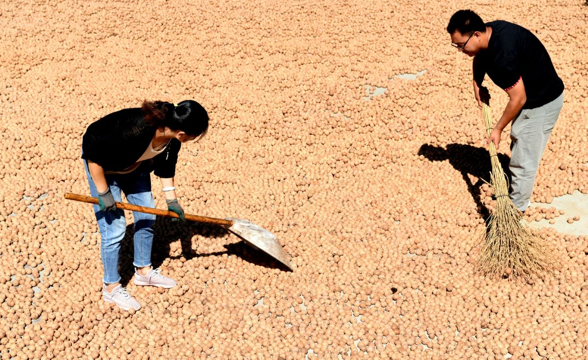 9月13日,垣曲县舜乡干果产业发展公司员工在晾晒核桃。