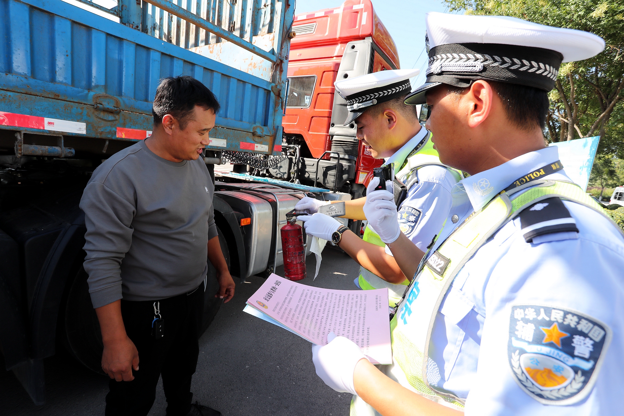 大货车竟配的“袖珍”灭火器。驾驶人现场学习交通安全知识。 樊朋展 摄