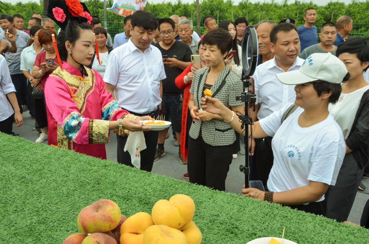 ▲在万荣县里望乡举办的2020年蟠桃会上,电商进行网络直播。特约摄影 解建国