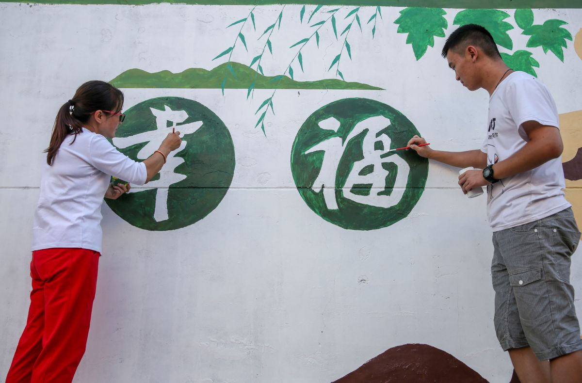 ▲青年志愿者在稷山县太阳乡小阳村的墙面上制作墙绘