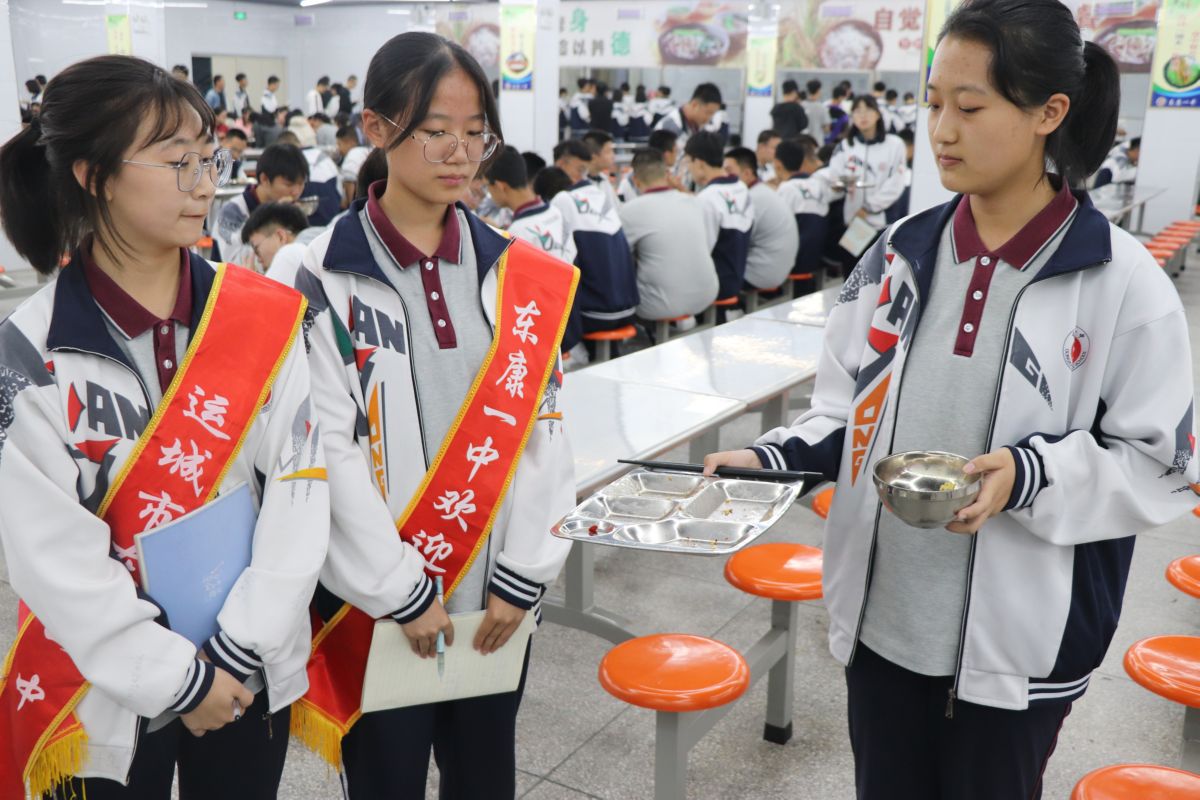 ▲9月21日下午,在东康一中的校园餐厅,由值班学生监督同学们把自己的饭菜吃完后再将餐盘送回。 王建朝 摄