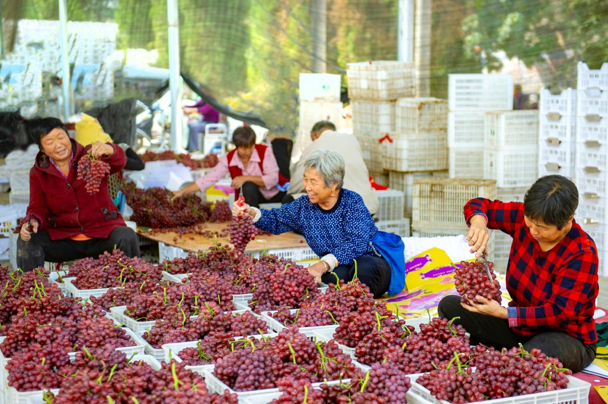 9月24日,盐湖区许贾村村民在收获晚熟葡萄品种“冰美人”。